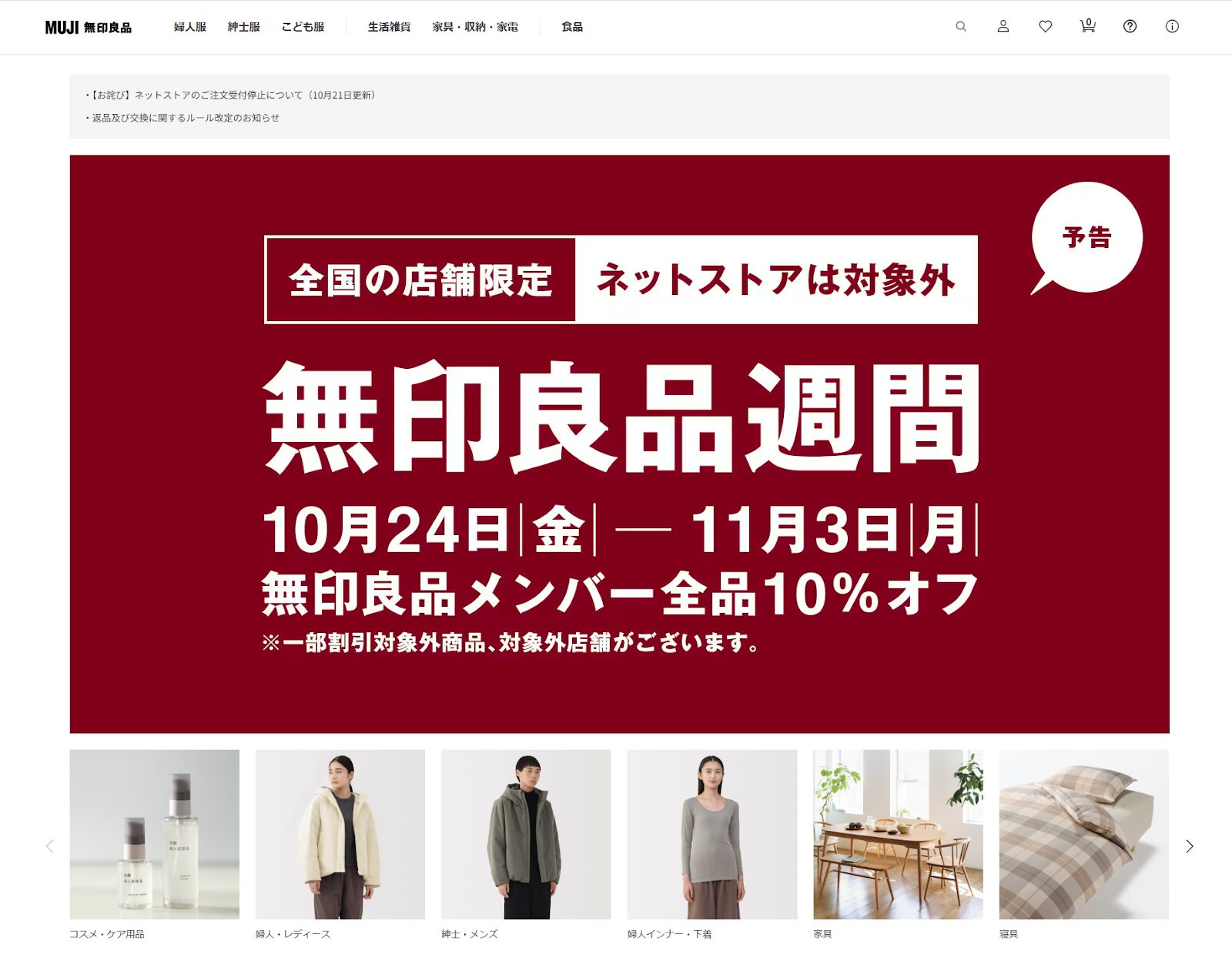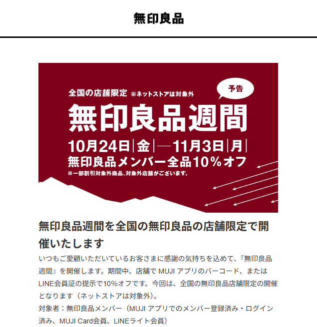 「無印良品週間」 メルマガ会員やアプリ会員になると、年に数回だけ開催される「無印良品週間」で、ほとんどの商品が10%OFFで買えちゃいます! 「登録したらすぐ10%OFF」じゃなくて「会員でいれば、無印良品週間中はずっとお得」というところがポイント。 ふだんから無印良品が好きな人や「いつか家具を…」と考えている人にとって、10%OFFは大きいですよね。 もちろん無印良品週間が近づくと、メルマガでお知らせが届きます。 「このセールを逃したくないから登録しよう!」という気持ちになってメルマガ登録しやすくなります。 |