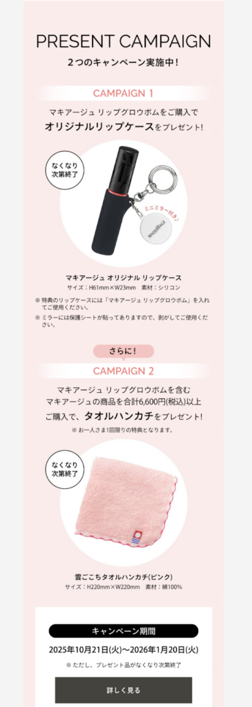 メルマガでは「今ならポイント10倍!」とか「〇〇円以上買うと、こんなプレゼントが!」みたいに「割引」だけじゃない「お得」を教えてくれます。 「メルマガ読者さんだけ先行販売」や「シークレットキャンペーン」など、「会員でよかった!」と思える情報が届くのも魅力です! |