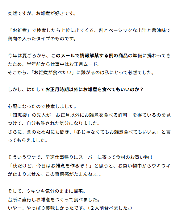 メルマガを通じて、どんな想いでこの商品を作っているのか、会社としてどんなことを大切にしているのか、といったストーリーを伝えていくと、だんだんと読者は共感を覚えてくれます。