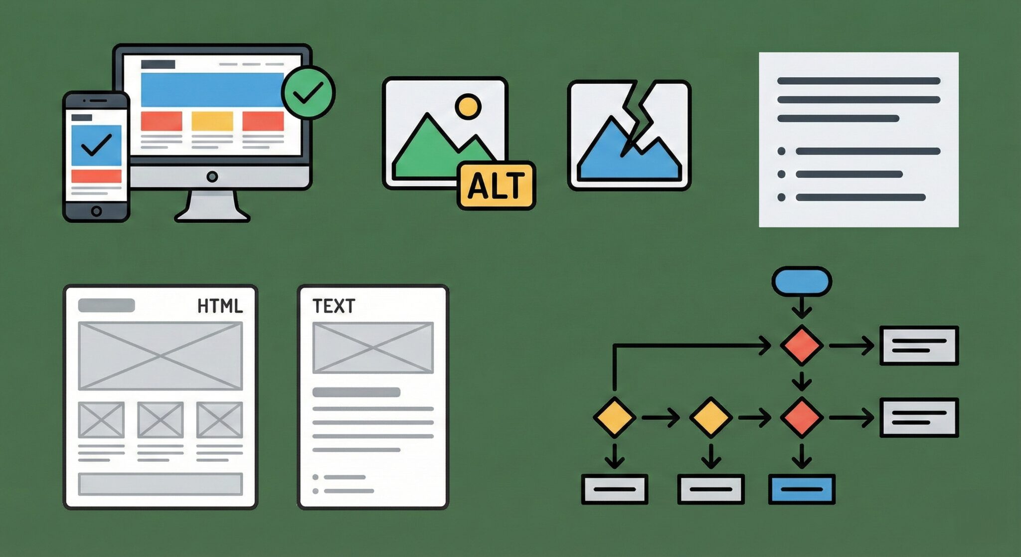 次に「画像がなくても内容の8割以上が伝わるか」を確認し、ノーであれば、画像ブロックのリスクを考慮してHTMLの構造を見直すか、テキスト主体の構成へシフトします。
