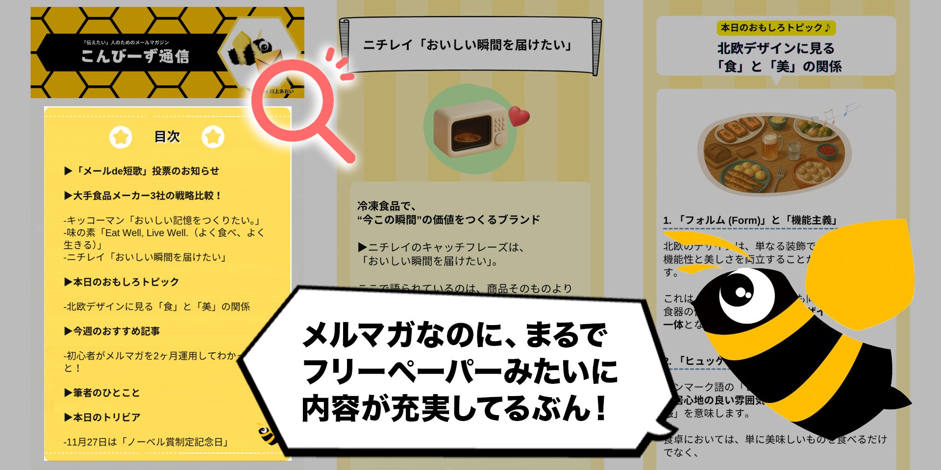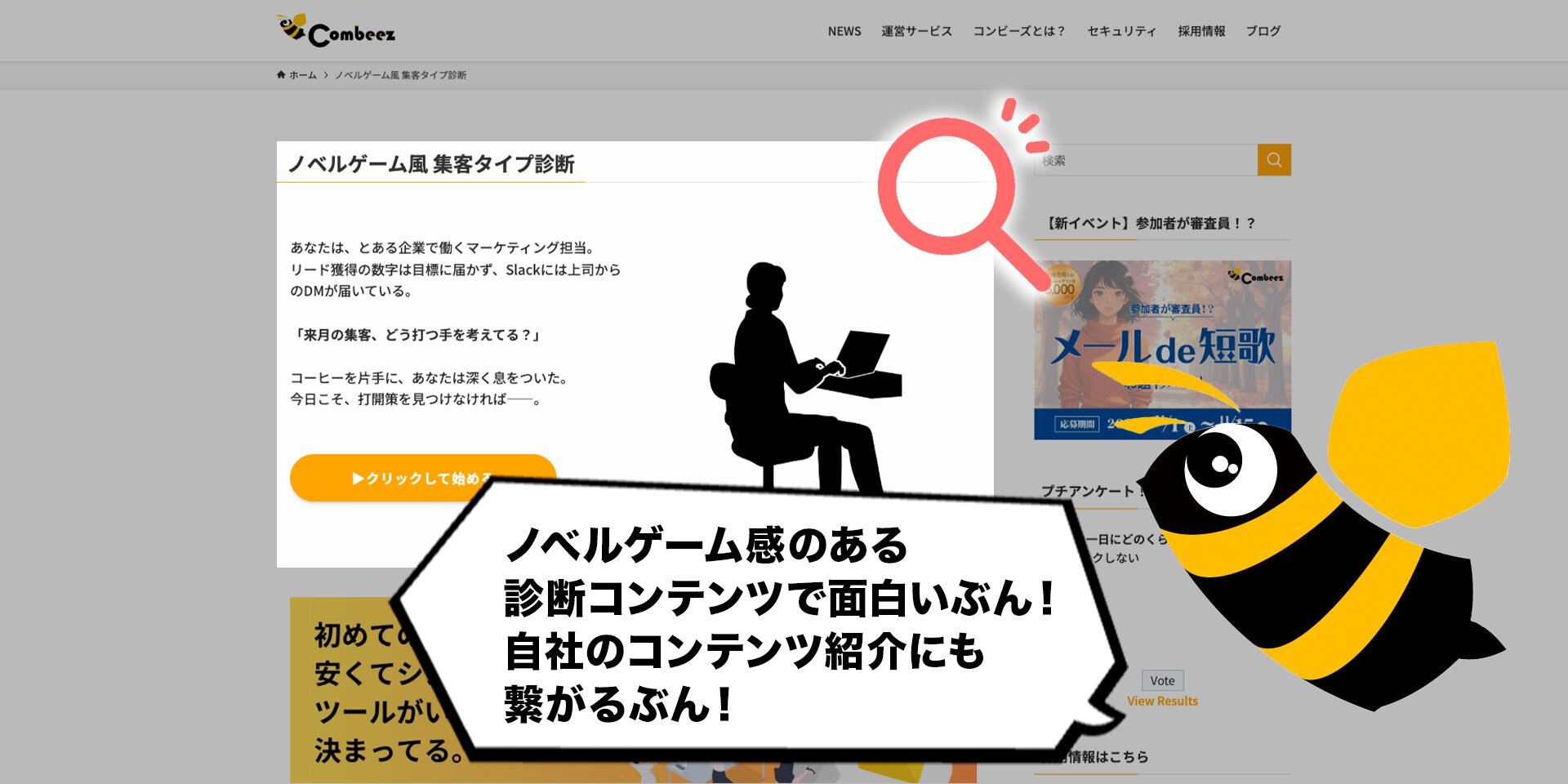 以下は選考のイメージです。あくまで一例ですので、「コンテンツ展開はないから無理!」「メルマガをやっていないから無理!」と決して思わないでください。調査させていただくのはアイディアの面白さや斬新さ、攻めっぷり、守りっぷりなど総合的な内容です。また、今回が初回なのでイメージでは当社コンビーズを例にしております。ぜひ「自演乙!」と叫んでください。