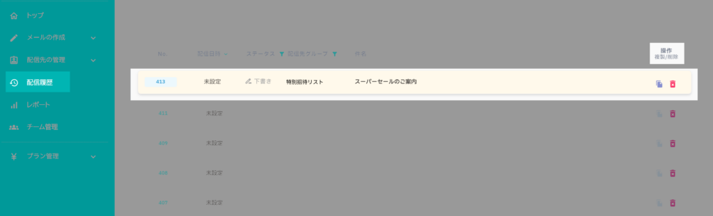 操作列の アイコン(複製) をクリックすると、同じ内容のメールが「下書き」で複製されます。