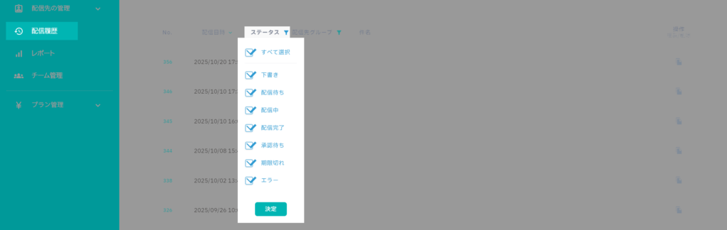 ドロップダウンからチェックを入れて「決定」を押すと、該当ステータスのメールだけを絞り込めます。