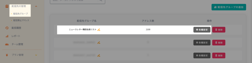 2. 任意の配信先グループで 「各種設定」 ボタンをクリック