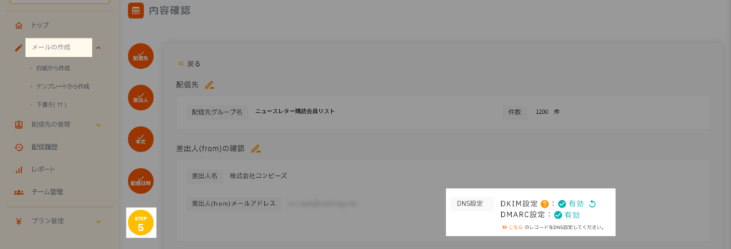 6. 管理画面 >メールの作成 > STEP3またはSTEP5 「差出人(from)の確認」 の DNS設定 が有効になっていることを確認