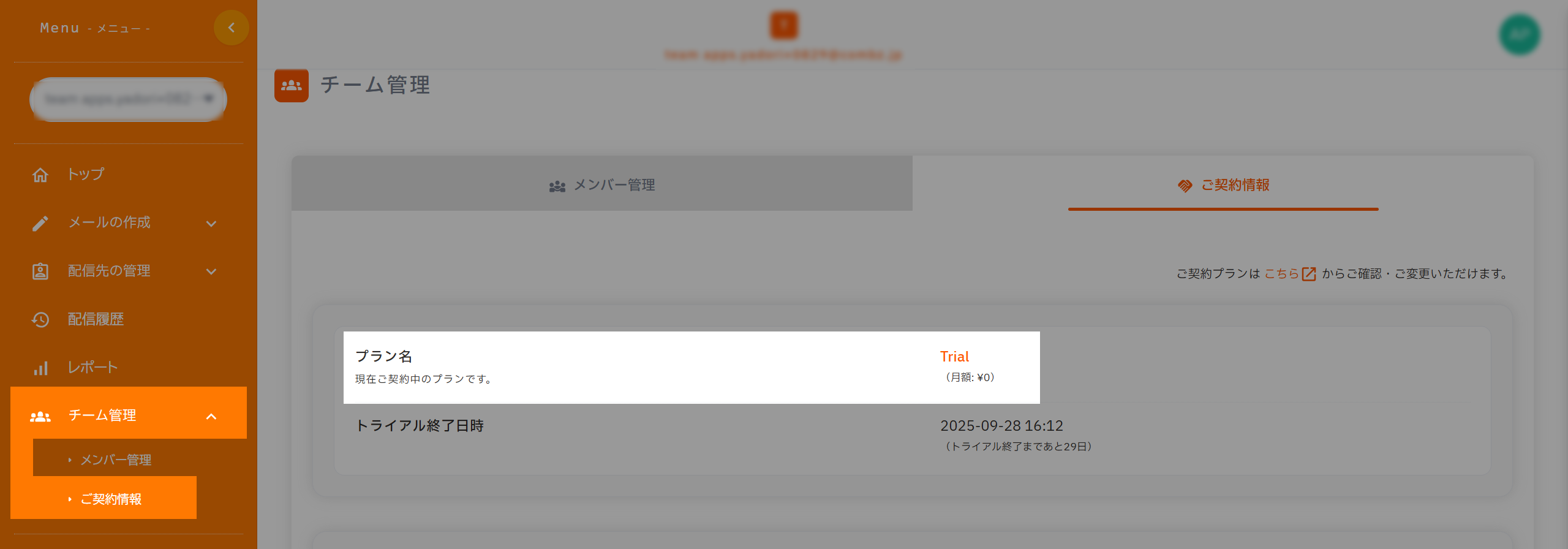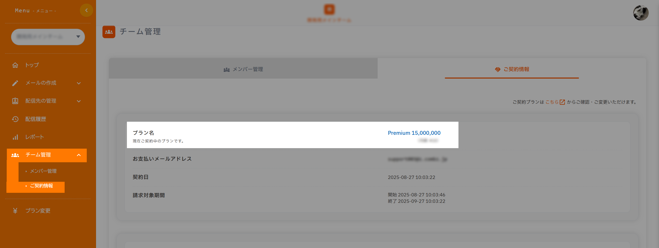 ログイン後のTOP画面左メニュー「チーム管理」にアクセスし、「ご契約情報」で現在ご利用中のプランが表示されます。