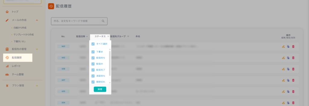 ドロップダウンからチェックを入れて「決定」を押すと、該当ステータスのメールだけを絞り込めます。
