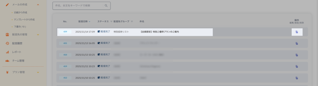 操作列の アイコン(複製) をクリックすると、同じ内容のメールが「下書き」で複製されます。