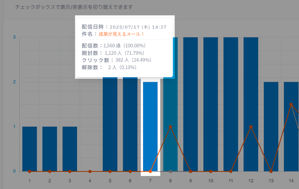 配信日時/件名/配信数・開封数・クリック率・解除率などの詳細ツールチップが表示されます。