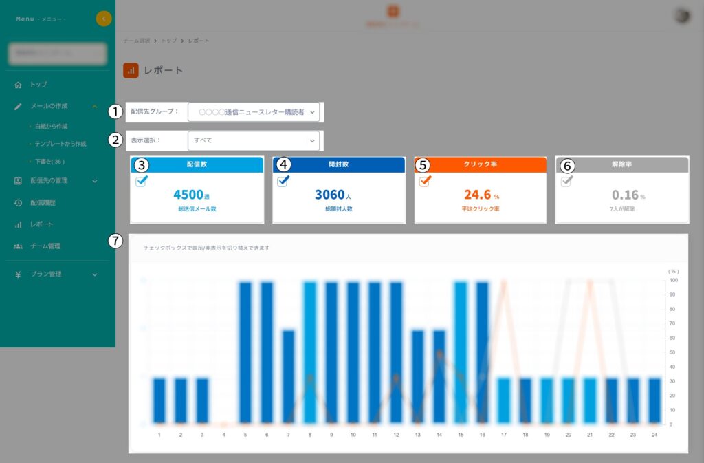 | ③ | 配信数 | 選択範囲で送信された総メール数 |