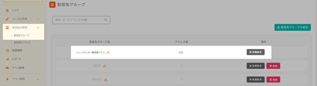 2. 任意の配信先グループの「各種設定」ボタンをクリック