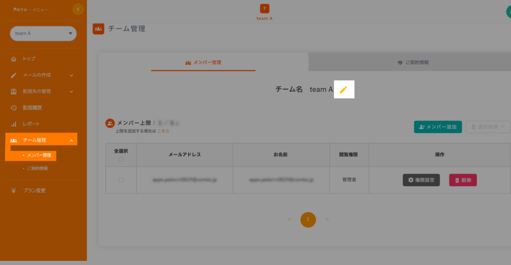 ①「チーム管理」>「メンバー管理」 の ✏️マーク をクリック。