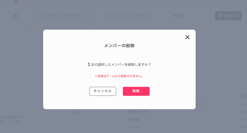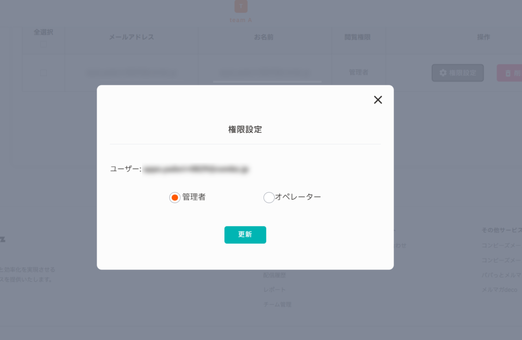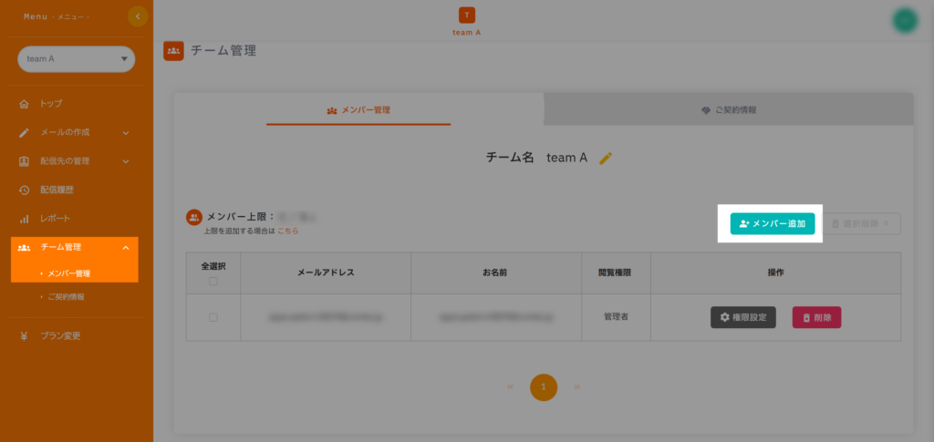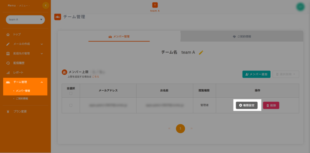 管理者 | メール作成・配信/配信先の管理/レポート確認/メンバー管理/チーム名変更/権限設定が可能 |