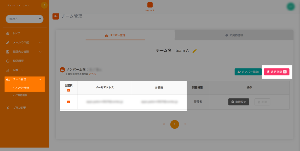 ①「チーム管理」>「メンバー管理」 で削除したいメンバーにチェックを入れる。